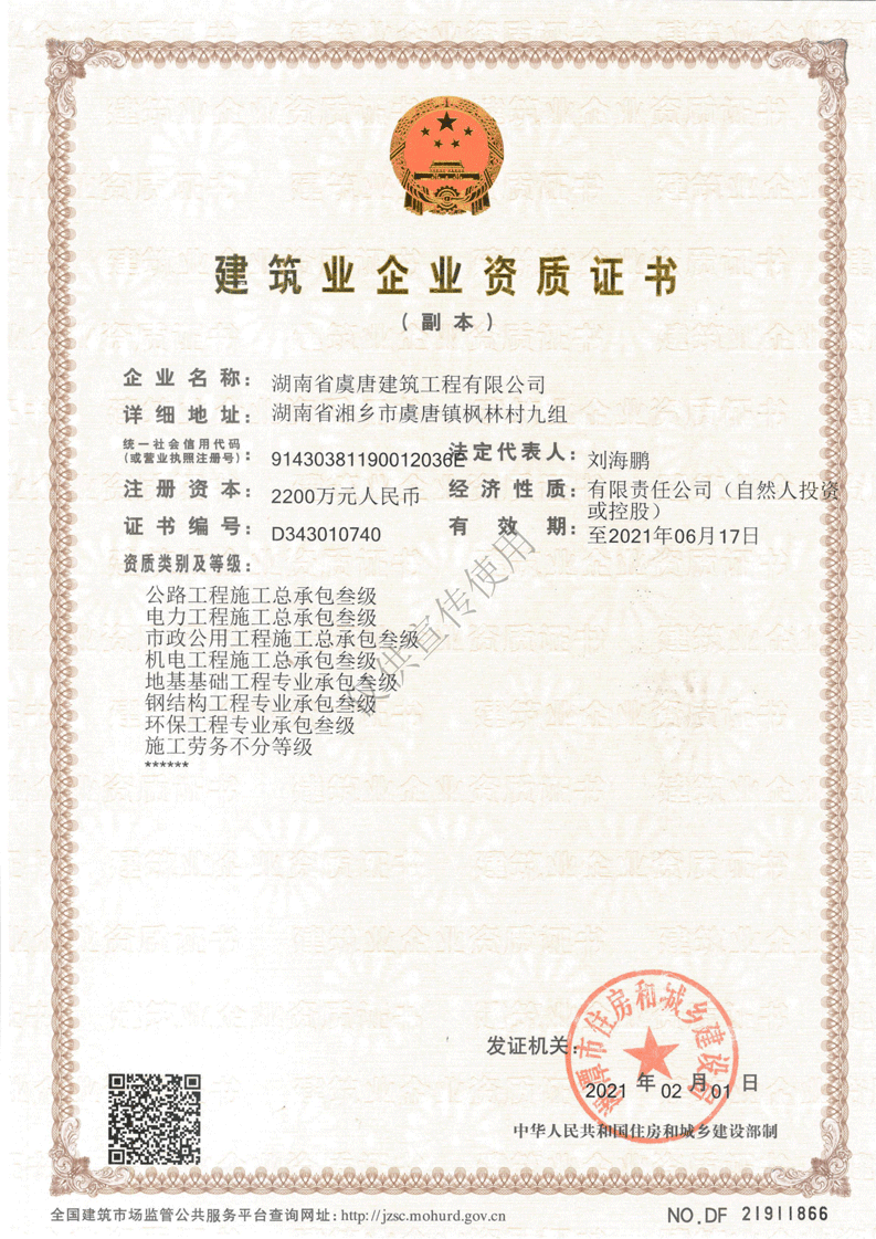 鋼結(jié)構(gòu)專業(yè)承包叁級、環(huán)保工程專業(yè)工程承包叁級、承裝(修、試)電力設(shè)施四級、路面養(yǎng)護乙級資質(zhì)、橋梁養(yǎng)護乙級資質(zhì)、隧道養(yǎng)護乙級資質(zhì)、交通安全設(shè)施養(yǎng)護乙級資質(zhì)、施工勞務(wù)不分等級等多項施工資質(zhì)。