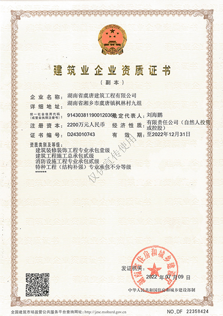 本公司具有建筑工程施工總承包貳級、消防設(shè)施工程專業(yè)承包貳級、建筑裝修裝飾專業(yè)承包壹級、特種工程(結(jié)構(gòu)補強)專業(yè)承包不分等級、